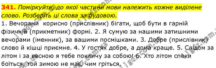 Поміркуйте, до якої частини мови належить кожне виділене слово. Розберіть ці слова за будовою. 1. Вечорами корисно (прислівник) бігати, щоб бути в гарній фізичній (прикметник) формі. 2. Я сумую за нашими затишними вечорами (іменник), за вашими посмішками. 3. Добре (прислівник) слово й кішці приємне. 4. У гостях добре, а дома краще. 5. Слідом за літом і за весною я тебе покличу за собою! 6. Хто літом спеки боїться, той зимою не має, чим гріться.