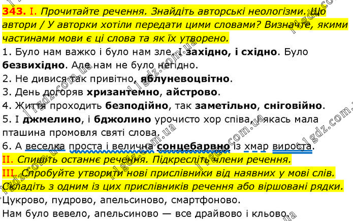 І. Прочитайте речення. Знайдіть авторські неологізми. Що автори / У авторки хотіли передати цими словами? Визначте, якими частинами мови є ці слова та як їх утворено. 1. Було нам важко і було нам зле. І західно, і східно. Було безвихідно. Але нам не було негідно. 2. Не дивися так привітно, яблуневоцвітно. 3. День догоряв хризантемно, айстрово. 4. Життя проходить безподійно, так заметільно, сніговійно. 5. І джмелино, і бджолино урочисто хор співа, і якась мала пташина промовля святі слова. 6. А веселка проста і велична сонцебарвно із хмар вироста. II. Спишіть останнє речення. Підкресліть члени речення. III. Спробуйте утворити нові прислівники від наявних у мові слів. Складіть з одним із цих прислівників речення або віршовані рядки. Цукрово, пудрово, апельсиново, смартфоново. Нам було вевело, апельсиново — все драйвово і кльово.