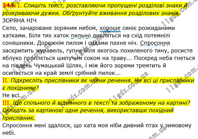 І. Спишіть текст, розставляючи пропущені розділові знаки й розкриваючи дужки. Обґрунтуйте вживання розділових знаків. ЗОРЯНА НІЧ Село, зачароване зоряним небом, хороше синіє розкиданими хатками. Біля тих хаток пильно дивляться на схід потемнілі соняшники. Дорожнім пилом і садами пахне ніч. Спросоння заскрипить журавель, гупне біля якогось похиленого тину, росисте яблуко проллється шипучим соком на траву... Посеред неба гнеться на південь Чумацький Шлях, і між його зорями тремтить й осипається на край землі срібний пилок... II. Підкресліть прислівники як члени речення. Чи всі ці прислівники є похідними? Не всі. ІІІ. Що спільного й відмінного в тексті та зображеному на картині? Складіть за картиною одне речення, використавши похідний прислівник. Спросоння мені здалося, що хата моя ніби дивний птах у зимовому небі.