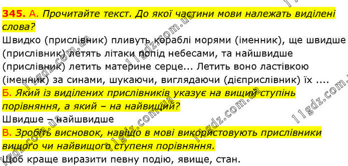 А. Прочитайте текст. До якої частини мови належать виділені слова? Швидко (прислівник) пливуть кораблі морями (іменник), ще швидше (прислівник) летять літаки попід небесами, та найшвидше (прислівник) летить материне серце... Летить воно ластівкою (іменник) за синами, шукаючи, виглядаючи (дієприслівник) їх .... Б. Який із виділених прислівників указує на вищий ступінь порівняння, а який – на найвищий? Швидше – найшвидше В. Зробіть висновок, навіщо в мові використовують прислівники вищого чи найвищого ступеня порівняння. Щоб краще виразити певну подію, явище, стан.
