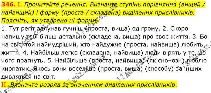 І. Прочитайте речення. Визначте ступінь порівняння (вищий / найвищий) і форму (проста / складена) виділених прислівників. Поясніть, як утворено ці форми. 1. Тут регіт залунав гучніш (проста, вища) од грому. 2. Скоро напишу тобі більш детально (складена, вища) про своє життя. 3. Бо на світі той наймудріший, хто найдужче (проста, найвища) любить життя. 4. Найбільш легко (складена, найвища) люди вірять у те, до чого прагнуть. 5. Найбільше (проста, найвища) (якісно–озн) люблю кирпатих. Якось вони веселіше (проста, вища) (способу) за інших дивляться на світ. II. Визначте розряд за значенням виділених прислівників.