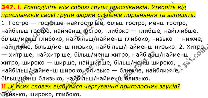 І. Розподіліть між собою групи прислівників. Утворіть від прислівників своєї групи форми ступенів порівняння та запишіть. 1. Гостро — гостріше–найгостріше, більш гостро, менш гостро, найбільш гостро, найменш гостро, глибоко — глибше, найглибше, більш/менш глибоко, найбільш/найменш глибоко, низько — нижче, найнижче, більш/менш низько, найбільш/найменш низько. 2. Хитро — хитріше, найхитріше, більш/менш хитро, найбільш/найменш хитро, широко — ширше, найширше, більш/менш широко, найбільш/найменш широко, близько — ближче, найближче, більш/менш близько, найбільш/найменш близько. II. У яких словах відбулися чергування приголосних звуків? Близько, широко, глибоко.