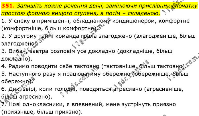 Запишіть кожне речення двічі, замінюючи прислівник спочатку простою формою вищого ступеня, а потім – складеною. 1. У спеку в приміщенні, обладнаному кондиціонером, комфортне (комфортніше, більш комфортне). 2. У другому таймі команда грала злагоджено (злагодженіше, більш злагоджено). 3. Вибач, завтра розповім усе докладно (докладніше, більш докладно). 4. Радимо поводити себе тактовно (тактовніше, більш тактовно). 5. Наступного разу я працюватиму обережно (обережніше, більш обережно). 6. Дикі звірі, коли голодні, поводяться агресивно (агресивніше, більш агресивно). 7. Нові однокласники, я впевнений, мене зустрінуть приязно (приязніше, більш приязно).