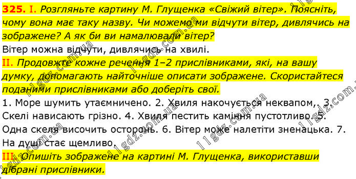 І. Розгляньте картину М. Глущенка «Свіжий вітер». Поясніть, чому вона має таку назву. Чи можемо ми відчути вітер, дивлячись на зображене? А як би ви намалювали вітер? Вітер можна відчути, дивлячись на хвилі. II. Продовжте кожне речення 1–2 прислівниками, які, на вашу думку, допомагають найточніше описати зображене. Скористайтеся поданими прислівниками або доберіть свої. 1. Море шумить утаємничено. 2. Хвиля накочується неквапом,. 3. Скелі нависають грізно. 4. Хвиля пестить каміння пустотливо. 5. Одна скеля височить осторонь. 6. Вітер може налетіти зненацька. 7. На душі стає щемливо. III. Опишіть зображене на картині М. Глущенка, використавши дібрані прислівники.