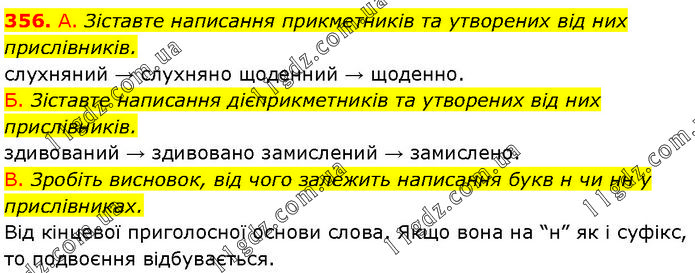 А. Зіставте написання прикметників та утворених від них прислівників. слухняний → слухняно щоденний → щоденно. Б. Зіставте написання дієприкметників та утворених від них прислівників. здивований → здивовано замислений → замислено. В. Зробіть висновок, від чого залежить написання букв н чи нн у прислівниках. Від кінцевої приголосної основи слова. Якщо вона на “н” як і суфікс, то подвоєння відбувається.