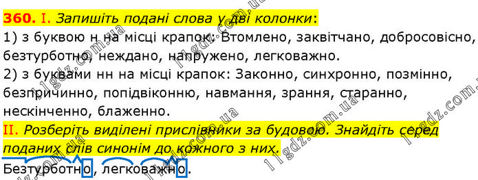 І. Запишіть подані слова у дві колонки: 1) з буквою н на місці крапок: Втомлено, заквітчано, добросовісно, безтурботно, неждано, напружено, легковажно. 2) з буквами нн на місці крапок: Законно, синхронно, позмінно, безпричинно, попідвіконню, навмання, зрання, старанно, нескінченно, блаженно. II. Розберіть виділені прислівники за будовою. Знайдіть серед поданих слів синонім до кожного з них. Безтурботно, легковажно.