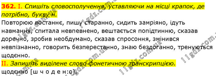 І. Спишіть словосполучення, уставляючи на місці крапок, де потрібно, букву н. Повторюю востаннє, пишу старанно, сидить замріяно, ідуть навмання, спитала невпевнено, вештається попідтинню, сказав доречно, зробив необдумано, сказав спросоння, змінився невпізнанно, говорить безперестанно, знаю бездоганно, тренуються щодєнно. II. Запишіть виділене слово фонетичною транскрипцією. щодєнно [ш ч о д е н:о].