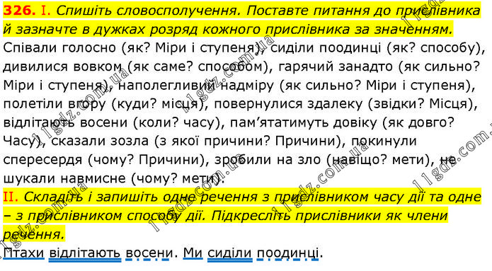 І. Спишіть словосполучення. Поставте питання до прислівника й зазначте в дужках розряд кожного прислівника за значенням. Співали голосно (як? Міри і ступеня), сиділи поодинці (як? способу), дивилися вовком (як саме? способом), гарячий занадто (як сильно? Міри і ступеня), наполегливий надміру (як сильно? Міри і ступеня), полетіли вгору (куди? місця), повернулися здалеку (звідки? Місця), відлітають восени (коли? часу), пам’ятатимуть довіку (як довго? Часу), сказали зозла (з якої причини? Причини), покинули спересердя (чому? Причини), зробили на зло (навіщо? мети), не шукали навмисне (чому? мети). II. Складіть і запишіть одне речення з прислівником часу дії та одне – з прислівником способу дії. Підкресліть прислівники як члени речення. Птахи відлітають восени. Ми сиділи поодинці.