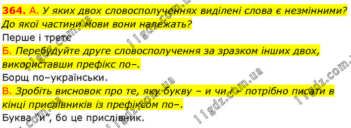 А. У яких двох словосполученнях виділені слова є незмінними? До якої частини мови вони належать? Перше і третє Б. Перебудуйте друге словосполучення за зразком інших двох, використавши префікс по–. Борщ по–українськи. В. Зробіть висновок про те, яку букву – и чи і – потрібно писати в кінці прислівників із префіксом по–. Буква “и”, бо це прислівник.