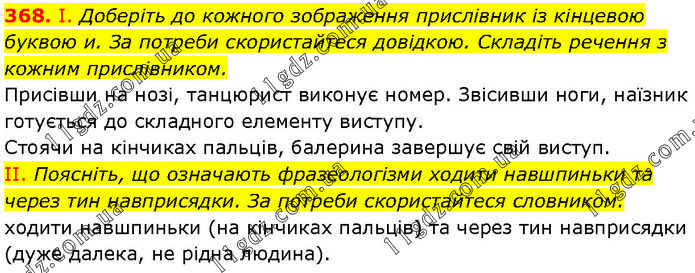 І. Доберіть до кожного зображення прислівник із кінцевою буквою и. За потреби скористайтеся довідкою. Складіть речення з кожним прислівником. Присівши на нозі, танцюрист виконує номер. Звісивши ноги, наїзник готується до складного елементу виступу. Стоячи на кінчиках пальців, балерина завершує свій виступ. II. Поясніть, що означають фразеологізми ходити навшпиньки та через тин навприсядки. За потреби скористайтеся словником. ходити навшпиньки (на кінчиках пальців) та через тин навприсядки (дуже далека, не рідна людина).