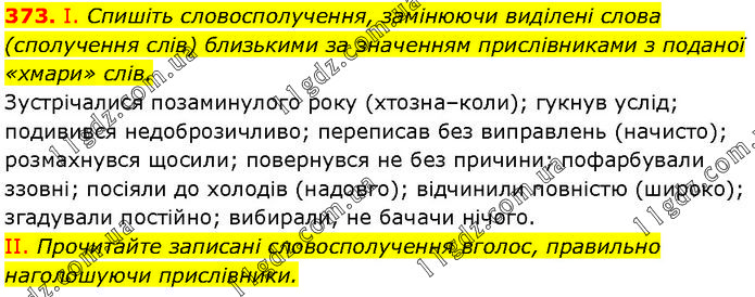 І. Спишіть словосполучення, замінюючи виділені слова (сполучення слів) близькими за значенням прислівниками з поданої «хмари» слів. Зустрічалися позаминулого року (хтозна–коли); гукнув услід; подивився недоброзичливо; переписав без виправлень (начисто); розмахнувся щосили; повернувся не без причини; пофарбували ззовні; посіяли до холодів (надовго); відчинили повністю (широко); згадували постійно; вибирали, не бачачи нічого. II. Прочитайте записані словосполучення вголос, правильно наголошуючи прислівники.