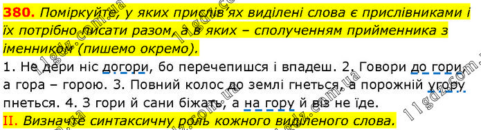Поміркуйте, у яких прислів’ях виділені слова є прислівниками і їх потрібно писати разом, а в яких – сполученням прийменника з іменником (пишемо окремо). 1. Не дери ніс догори, бо перечепишся і впадеш. 2. Говори до гори, а гора – горою. 3. Повний колос до землі гнеться, а порожній угору пнеться. 4. З гори й сани біжать, а на гору й віз не їде. II. Визначте синтаксичну роль кожного виділеного слова.