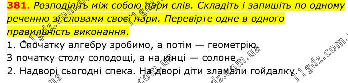 Розподіліть між собою пари слів. Складіть і запишіть по одному реченню зі словами своєї пари. Перевірте одне в одного правильність виконання. 1. Спочатку алгебру зробимо, а потім — геометрію. З початку столу солодощі, а на кінці — солоне. 2. Надворі сьогодні спека. На дворі діти зламали гойдалку.
