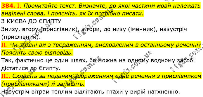 І. Прочитайте текст. Визначте, до якої частини мови належать виділені слова, і поясніть, як їх потрібно писати. З КИЄВА ДО ЄГИПТУ Знизу, вгору (прислівник), з гори, до низу (іменник), назустріч (прислівник). II. Чи згодні ви з твердженням, висловленим в останньому реченні? Поясніть свою відповідь. Так, фактично це один шлях, бо можна на одному водному засобі дістатися до Єгипту. III. Складіть за поданим зображенням одне речення з прислівником (прислівниками) й запишіть. Назустріч вітрам теплим відлітають птахи у вирій натхненно.