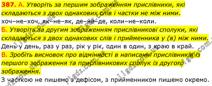 А. Утворіть за першим зображенням прислівники, які складаються з двох однакових слів і частки не між ними. хоч–не–хоч, як–не–як, де–не–де, коли–не–коли. Б. Утворіть за другим зображенням прислівникові сполуки, які складаються з двох однакових слів і прийменника у (в) між ними. День у день, раз у раз, рік у рік, один в один, з краю в край. В. Зробіть висновок про відмінності в написанні прислівників із першого зображення та прислівникових сполук із другого зображення. З часткою не пишемо з дефісом, з прийменником пишемо окремо.