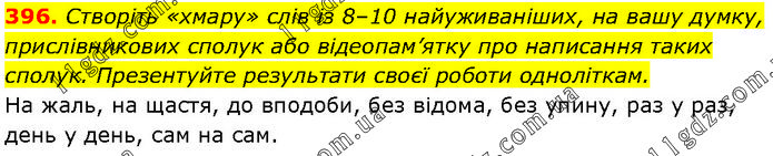 Створіть «хмару» слів із 8–10 найуживаніших, на вашу думку, прислівникових сполук або відеопам’ятку про написання таких сполук. Презентуйте результати своєї роботи одноліткам. На жаль, на щастя, до вподоби, без відома, без упину, раз у раз, день у день, сам на сам.