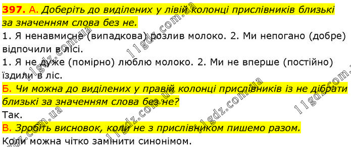 А. Доберіть до виділених у лівій колонці прислівників близькі за значенням слова без не. 1. Я ненавмисне (випадкова) розлив молоко. 2. Ми непогано (добре) відпочили в лісі. 1. Я не дуже (помірно) люблю молоко. 2. Ми не вперше (постійно) їздили в ліс. Б. Чи можна до виділених у правій колонці прислівників із не дібрати близькі за значенням слова без не? Так. В. Зробіть висновок, коли не з прислівником пишемо разом. Коли можна чітко замінити синонімом.