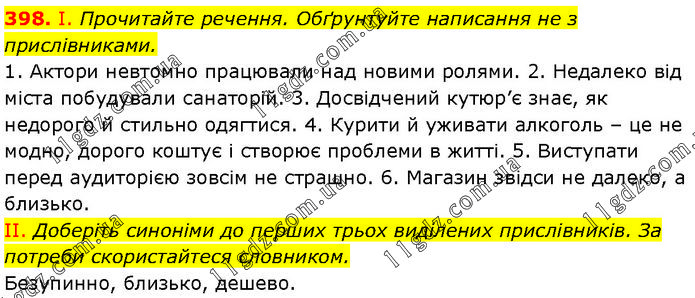 І. Прочитайте речення. Обґрунтуйте написання не з прислівниками. 1. Актори невтомно працювали над новими ролями. 2. Недалеко від міста побудували санаторій. 3. Досвідчений кутюр’є знає, як недорого й стильно одягтися. 4. Курити й уживати алкоголь – це не модно, дорого коштує і створює проблеми в житті. 5. Виступати перед аудиторією зовсім не страшно. 6. Магазин звідси не далеко, а близько. II. Доберіть синоніми до перших трьох виділених прислівників. За потреби скористайтеся словником. Безупинно, близько, дешево.