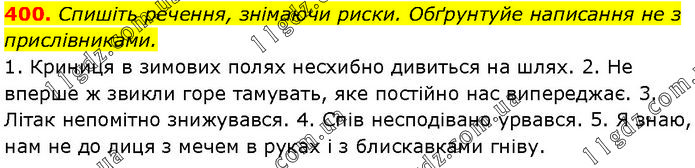 Спишіть речення, знімаючи риски. Обґрунтуйе написання не з прислівниками. 1. Криниця в зимових полях несхибно дивиться на шлях. 2. Не вперше ж звикли горе тамувать, яке постійно нас випереджає. 3. Літак непомітно знижувався. 4. Спів несподівано урвався. 5. Я знаю, нам не до лиця з мечем в руках і з блискавками гніву.