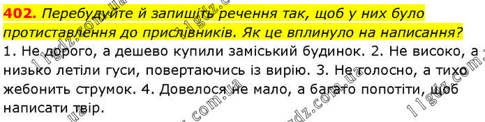 Перебудуйте й запишіть речення так, щоб у них було протиставлення до прислівників. Як це вплинуло на написання? 1. Не дорого, а дешево купили заміський будинок. 2. Не високо, а низько летіли гуси, повертаючись із вирію. 3. Не голосно, а тихо жебонить струмок. 4. Довелося не мало, а багато попотіти, щоб написати твір.