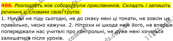 Розподіліть між собою групи прислівників. Складіть і запишіть речення зі словами своєї групи. 1. Нікуди не піду сьогодні, не до смаку мені ці томати, не зовсім це правильно, чесно кажучи. 2. Нітрохи ні шкода мені його, не вперше попереджали нас учителі про контрольні, не дуже мені хочеться залишатися після уроків.