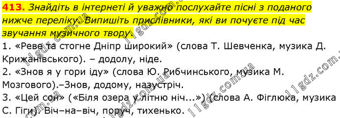 Знайдіть в інтернеті й уважно послухайте пісні з поданого нижче переліку. Випишіть прислівники, які ви почуєте під час звучання музичного твору. 1. «Реве та стогне Дніпр широкий» (слова Т. Шевченка, музика Д. Крижанівського). – додолу, ніде. 2. «Знов я у гори іду» (слова Ю. Рибчинського, музика М. Мозгового).–Знов, додому, назустріч. 3. «Цей сон» («Біля озера у літню ніч...») (слова А. Фіглюка, музика С. Гіги). Віч–на–віч, поруч, тихенько.