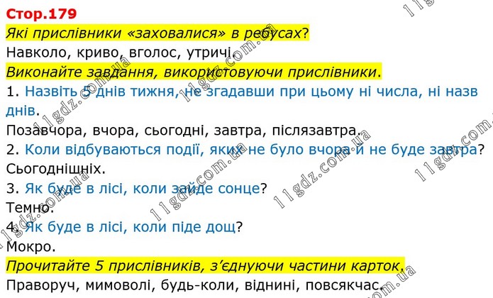 Які прислівники «заховалися» в ребусах? Навколо, криво, вголос, утричі. Виконайте завдання, використовуючи прислівники. 1. Назвіть 5 днів тижня, не згадавши при цьому ні числа, ні назв днів. Позавчора, вчора, сьогодні, завтра, післязавтра. 2. Коли відбуваються події, яких не було вчора й не буде завтра? Сьогоднішніх. 3. Як буде в лісі, коли зайде сонце? Темно. 4. Як буде в лісі, коли піде дощ? Мокро. Прочитайте 5 прислівників, з’єднуючи частини карток. Праворуч, мимоволі, будь-коли, віднині, повсякчас.