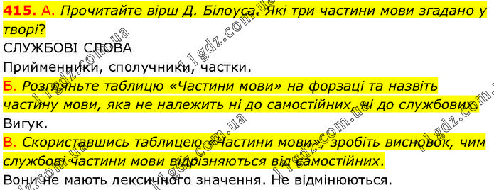 А. Прочитайте вірш Д. Білоуса. Які три частини мови згадано у творі? СЛУЖБОВІ СЛОВА Прийменники, сполучники, частки. Б. Розгляньте таблицю «Частини мови» на форзаці та назвіть частину мови, яка не належить ні до самостійних, ні до службових. Вигук. В. Скориставшись таблицею «Частини мови», зробіть висновок, чим службові частини мови відрізняються від самостійних. Вони не мають лексичного значення. Не відмінюються.
