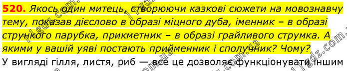 Якось один митець, створюючи казкові сюжети на мовознавчу тему, показав дієслово в образі міцного дуба, іменник – в образі стрункого парубка, прикметник – в образі грайливого струмка. А якими у вашій уяві постають прийменник і сполучник? Чому? У вигляді гілля, листя, риб — все це дозволяє функціонувати іншим.