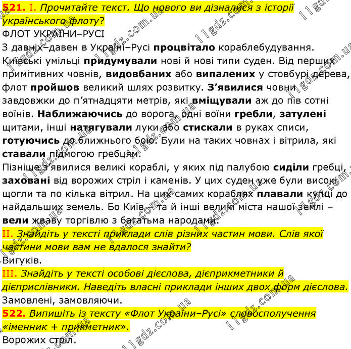 521. І. Прочитайте текст. Що нового ви дізналися з історії українського флоту? ФЛОТ УКРАЇНИ–РУСІ З давніх–давен в Україні–Русі процвітало кораблебудування. Київські умільці придумували нові й нові типи суден. Від перших примітивних човнів, видовбаних або випалених у стовбурі дерева, флот пройшов великий шлях розвитку. З’явилися човни завдовжки до п’ятнадцяти метрів, які вміщували аж до пів сотні воїнів. Наближаючись до ворога, одні воїни гребли, затулені щитами, інші натягували луки або стискали в руках списи, готуючись до ближнього бою. Були на таких човнах і вітрила, які ставали підмогою гребцям. Пізніше з’явилися великі кораблі, у яких під палубою сиділи гребці, заховані від ворожих стріл і каменів. У цих суден уже були високі щогли та по кілька вітрил. На цих самих кораблях плавали купці до найдальших земель. Бо Київ – та й інші великі міста нашої землі – вели жваву торгівлю з багатьма народами. II. Знайдіть у тексті приклади слів різних частин мови. Слів якої частини мови вам не вдалося знайти? Вигуків. III. Знайдіть у тексті особові дієслова, дієприкметники й дієприслівники. Наведіть власні приклади інших двох форм дієслова. Замовлені, замовляючи. 522. Випишіть із тексту «Флот України–Русі» словосполучення «іменник + прикметник». Ворожих стріл.