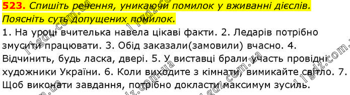 Спишіть речення, уникаючи помилок у вживанні дієслів. Поясніть суть допущених помилок. 1. На уроці вчителька навела цікаві факти. 2. Ледарів потрібно змусити працювати. 3. Обід заказали(замовили) вчасно. 4. Відчинить, будь ласка, двері. 5. У виставці брали участь провідні художники України. 6. Коли виходите з кімнати, вимикайте світло. 7. Щоб виконати завдання, потрібно докласти максимум зусиль.