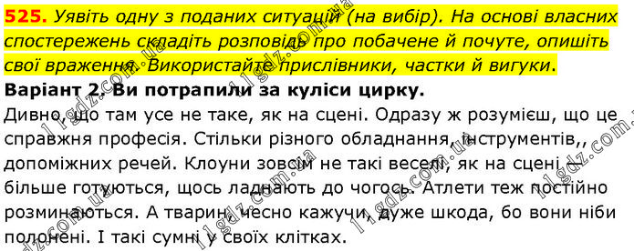 Уявіть одну з поданих ситуацій (на вибір). На основі власних спостережень складіть розповідь про побачене й почуте, опишіть свої враження. Використайте прислівники, частки й вигуки. Варіант 2. Ви потрапили за куліси цирку. Дивно, що там усе не таке, як на сцені. Одразу ж розумієш, що це справжня професія. Стільки різного обладнання, інструментів,, допоміжних речей. Клоуни зовсім не такі веселі, як на сцені — більше готуються, щось ладнають до чогось. Атлети теж постійно розминаються. А тварин, чесно кажучи, дуже шкода, бо вони ніби полонені. І такі сумні у своїх клітках.