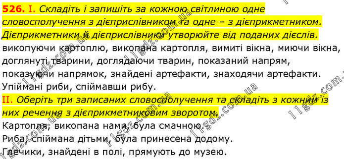І. Складіть і запишіть за кожною світлиною одне словосполучення з дієприслівником та одне – з дієприкметником. Дієприкметники й дієприслівники утворюйте від поданих дієслів. Викопуючи картоплю, викопана картопля, вимиті вікна, миючи вікна, доглянуті тварини, доглядаючи тварин, показаний напрям, показуючи напрямок, знайдені артефакти, знаходячи артефакти. Упіймані риби, спіймавши рибу. II. Оберіть три записаних словосполучення та складіть з кожним із них речення з дієприкметниковим зворотом. Картопля, викопана нами, була смачною. Риба, спіймана дітьми, була принесена додому. Глечики, знайдені в полі, прямують до музею.