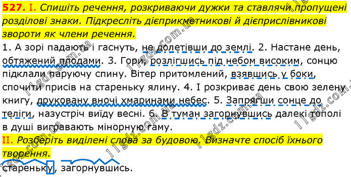 І. Спишіть речення, розкриваючи дужки та ставлячи пропущені розділові знаки. Підкресліть дієприкметникові й дієприслівникові звороти як члени речення. 1. А зорі падають і гаснуть, не долетівши до землі. 2. Настане день, обтяжений плодами. 3. Гори, розлігшись під небом високим, сонцю підклали паруючу спину. Вітер притомлений, взявшись у боки, спочити присів на стареньку ялину. 4. І розкриває день свою зелену книгу, друковану вночі хмаринами небес. 5. Запрягши сонце до теліги, назустріч виїду весні. 6. В туман загорнувшись далекі тополі в душі вигравають мінорную гаму. II. Розберіть виділені слова за будовою. Визначте спосіб їхнього творення. стареньку, загорнувшись.