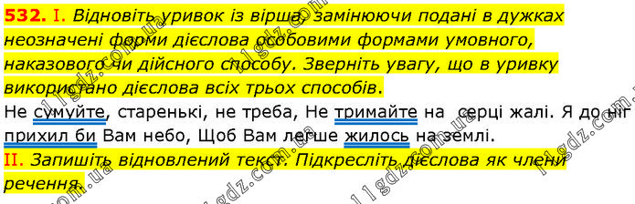 І. Відновіть уривок із вірша, замінюючи подані в дужках неозначені форми дієслова особовими формами умовного, наказового чи дійсного способу. Зверніть увагу, що в уривку використано дієслова всіх трьох способів. Не сумуйте, старенькі, не треба, Не тримайте на серці жалі. Я до ніг прихил би Вам небо, Щоб Вам легше жилось на землі. II. Запишіть відновлений текст. Підкресліть дієслова як члени речення.