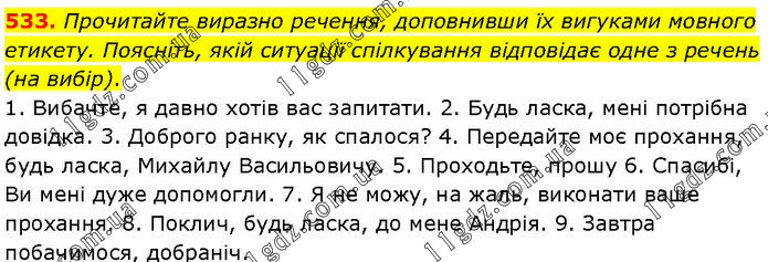 Прочитайте виразно речення, доповнивши їх вигуками мовного етикету. Поясніть, якій ситуації спілкування відповідає одне з речень (на вибір). 1. Вибачте, я давно хотів вас запитати. 2. Будь ласка, мені потрібна довідка. 3. Доброго ранку, як спалося? 4. Передайте моє прохання, будь ласка, Михайлу Васильовичу. 5. Проходьте, прошу 6. Спасибі, Ви мені дуже допомогли. 7. Я не можу, на жаль, виконати ваше прохання. 8. Поклич, будь ласка, до мене Андрія. 9. Завтра побачимося, добраніч.