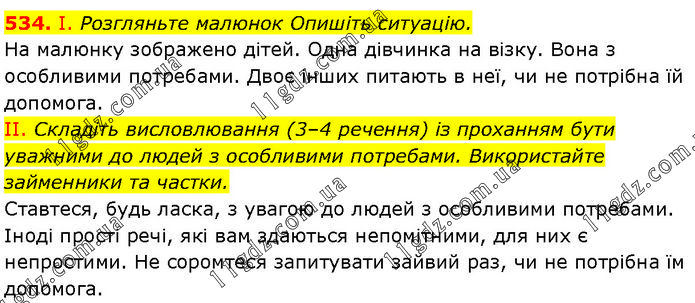 I. Розгляньте малюнок Опишіть ситуацію. На малюнку зображено дітей. Одна дівчинка на візку. Вона з особливими потребами. Двоє інших питають в неї, чи не потрібна їй допомога. II. Складіть висловлювання (3–4 речення) із проханням бути уважними до людей з особливими потребами. Використайте займенники та частки. Ставтеся, будь ласка, з увагою до людей з особливими потребами. Іноді прості речі, які вам здаються непомітними, для них є непростими. Не соромтеся запитувати зайвий раз, чи не потрібна їм допомога.