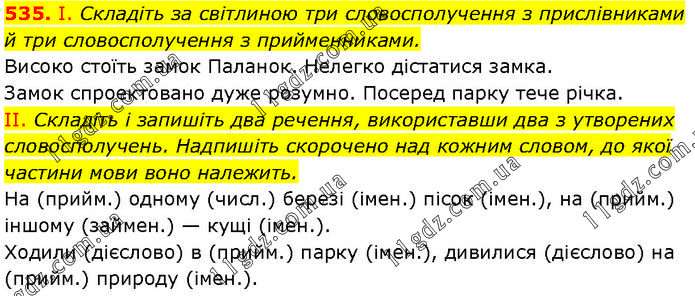 І. Складіть за світлиною три словосполучення з прислівниками й три словосполучення з прийменниками. Високо стоїть замок Паланок. Нелегко дістатися замка. Замок спроектовано дуже розумно. Посеред парку тече річка. II. Складіть і запишіть два речення, використавши два з утворених словосполучень. Надпишіть скорочено над кожним словом, до якої частини мови воно належить. На (прийм.) одному (числ.) березі (імен.) пісок (імен.), на (прийм.) іншому (займен.) — кущі (імен.). Ходили (дієслово) в (прийм.) парку (імен.), дивилися (дієслово) на (прийм.) природу (імен.).