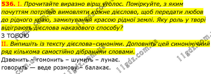 І. Прочитайте виразно вірш уголос. Поміркуйте, з яким почуттям потрібно вимовляти кожне дієслово, щоб передати любов до рідного краю, замилування красою рідної землі. Яку роль у творі відіграють дієслова наказового способу? З ТОБОЮ II. Випишіть із тексту дієслова–синоніми. Доповніть цей синонімічний ряд кількома самостійно дібраними словами. Дзвенить – гомонить – шумить – лунає. говорить — веде розмову – балакає.