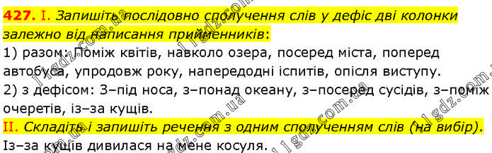 І. Запишіть послідовно сполучення слів у дефіс дві колонки залежно від написання прийменників: 1) разом: Поміж квітів, навколо озера, посеред міста, поперед автобуса, упродовж року, напередодні іспитів, опісля виступу. 2) з дефісом: З–під носа, з–понад океану, з–посеред сусідів, з–поміж очеретів, із–за кущів. II. Складіть і запишіть речення з одним сполученням слів (на вибір). Із–за кущів дивилася на мене косуля.
