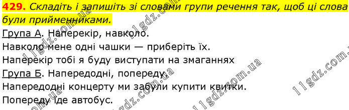 Складіть і запишіть зі словами групи речення так, щоб ці слова були прийменниками. Група А. Наперекір, навколо. Навколо мене одні чашки — приберіть їх. Наперекір тобі я буду виступати на змаганнях Група Б. Напередодні, попереду. Напередодні концерту ми забули купити квитки. Попереду їде автобус.