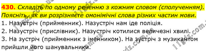 Складіть по одному реченню з кожним словом (сполученням). Поясніть, як ви розрізняєте омонімічні слова різних частин мови. 1. Назустріч (прийменник). Назустріч нам іде поліція. 2. Назустріч (прислівник). Назустріч котилися величезні хвилі. 3. На зустріч (прийменник з іменником). На зустріч з музикантом прийшли його шанувальники.