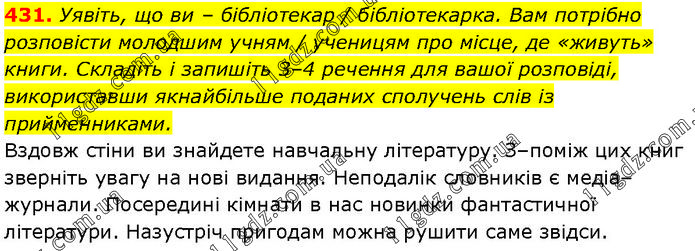 Уявіть, що ви – бібліотекар / бібліотекарка. Вам потрібно розповісти молодшим учням / ученицям про місце, де «живуть» книги. Складіть і запишіть 3–4 речення для вашої розповіді, використавши якнайбільше поданих сполучень слів із прийменниками. Вздовж стіни ви знайдете навчальну літературу. З–поміж цих книг зверніть увагу на нові видання. Неподалік словників є медіа–журнали. Посередині кімнати в нас новинки фантастичної літератури. Назустріч пригодам можна рушити саме звідси.