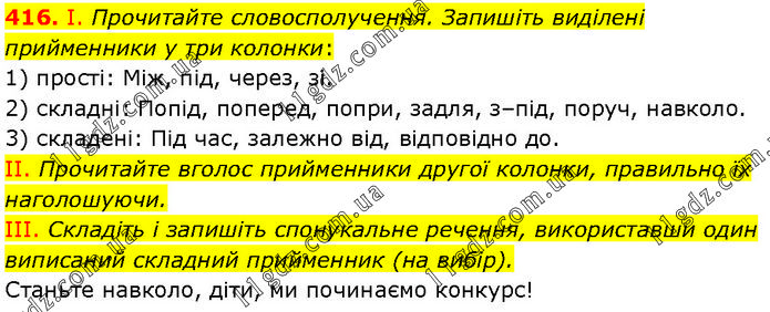 І. Прочитайте словосполучення. Запишіть виділені прийменники у три колонки: 1) прості: Між, під, через, зі. 2) складні: Попід, поперед, попри, задля, з–під, поруч, навколо. 3) складені: Під час, залежно від, відповідно до. II. Прочитайте вголос прийменники другої колонки, правильно їх наголошуючи. III. Складіть і запишіть спонукальне речення, використавши один виписаний складний прийменник (на вибір). Станьте навколо, діти, ми починаємо конкурс!
