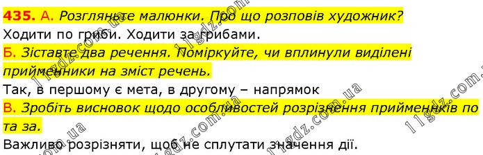 А. Розгляньте малюнки. Про що розповів художник? Ходити по гриби. Ходити за грибами. Б. Зіставте два речення. Поміркуйте, чи вплинули виділені прийменники на зміст речень. Так, в першому є мета, в другому – напрямок В. Зробіть висновок щодо особливостей розрізнення прийменнків по та за. Важливо розрізняти, щоб не сплутати значення дії.