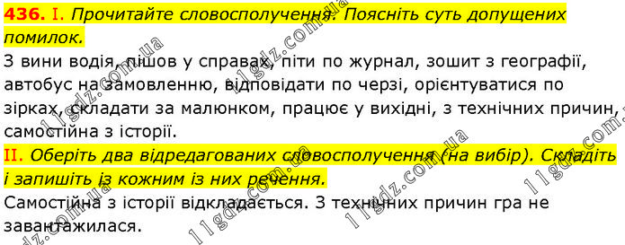 І. Прочитайте словосполучення. Поясніть суть допущених помилок. З вини водія, пішов у справах, піти по журнал, зошит з географії, автобус на замовленню, відповідати по черзі, орієнтуватися по зірках, складати за малюнком, працює у вихідні, з технічних причин, самостійна з історії. II. Оберіть два відредагованих словосполучення (на вибір). Складіть і запишіть із кожним із них речення. Самостійна з історії відкладається. З технічних причин гра не завантажилася.