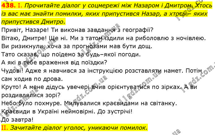 І. Прочитайте діалог у соцмережі між Назаром і Дмитром. Хтось із вас має знайти помилки, яких припустився Назар, а хтось – яких припустився Дмитро. Привіт, Назаре! Ти виконав завдання з географії? Вітаю, Дмитре! Ще ні. Ми з татом їздили на риболовлю з ночівлею. Ви ризикнули, хоча за прогнозами мав бути дощ. Тато сказав, що поїдемо за будь–якої погоди. А які в тебе враження від поїздки? Чудові! Адже я навчився за інструкцією розставляти намет. Потім сам ходив по дрова. Круто! А мене дідусь увечері вчив орієнтуватися по зірках. А ви роздивлялися зорі? Небо було похмуре. Милувалися краєвидами на світанку. Краєвиди в Україні неймовірні. До зустрічі! До завтра! II. Зачитайте діалог уголос, уникаючи помилок.