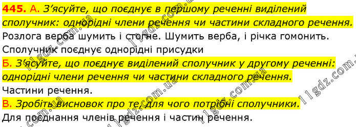 А. З’ясуйте, що поєднує в першому реченні виділений сполучник: однорідні члени речення чи частини складного речення. Розлога верба шумить і стогне. Шумить верба, і річка гомонить. Сполучник поєднує однорідні присудки Б. З’ясуйте, що поєднує виділений сполучник у другому реченні: однорідні члени речення чи частини складного речення. Частини речення. В. Зробіть висновок про те, для чого потрібні сполучники. Для поєднання членів речення і частин речення.