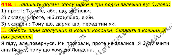 І. Запишіть подані сполучники в три рядки залежно від будови: 1) прості: Та, але, або, що, як, поки. 2) складні: Проте, нібито, якщо, якби. 3) складені: Тому що, дарма що, перед тим як. II. Оберіть один сполучник із кожної колонки. Складіть з кожним із них речення. Я піду, але повернуся. Ми програли, проте не здалися. Я буду вчити англійську, тому що хочу до Лондона.