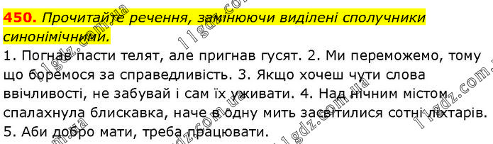 Прочитайте речення, замінюючи виділені сполучники синонімічними. 1. Погнав пасти телят, але пригнав гусят. 2. Ми переможемо, тому що боремося за справедливість. 3. Якщо хочеш чути слова ввічливості, не забувай і сам їх уживати. 4. Над нічним містом спалахнула блискавка, наче в одну мить засвітилися сотні ліхтарів. 5. Аби добро мати, треба працювати.
